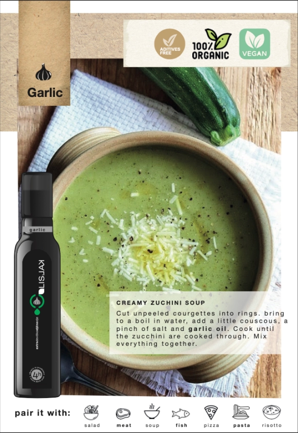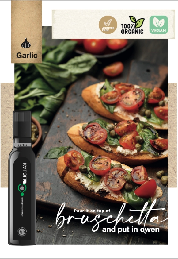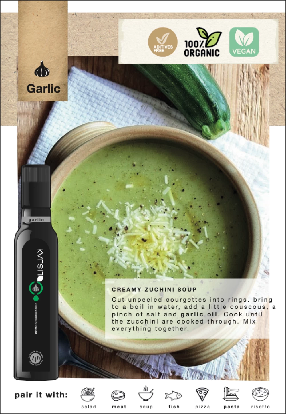 Garlic infused olive oil is made from olives and organic garlic. It is suitable for just about any dish where garlic is used, except that you do not need to chop the garlic, but just pour this oil over the dish and thus conjure up a true Mediterranean poetry of flavors.